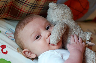 You are becoming more attached to certain objects, like the bear in your monthly photos, and the small, soft security blanket we got you. You chew on them both, and open and close your hands when you see them, as if you just can't wait to get them in your hands.